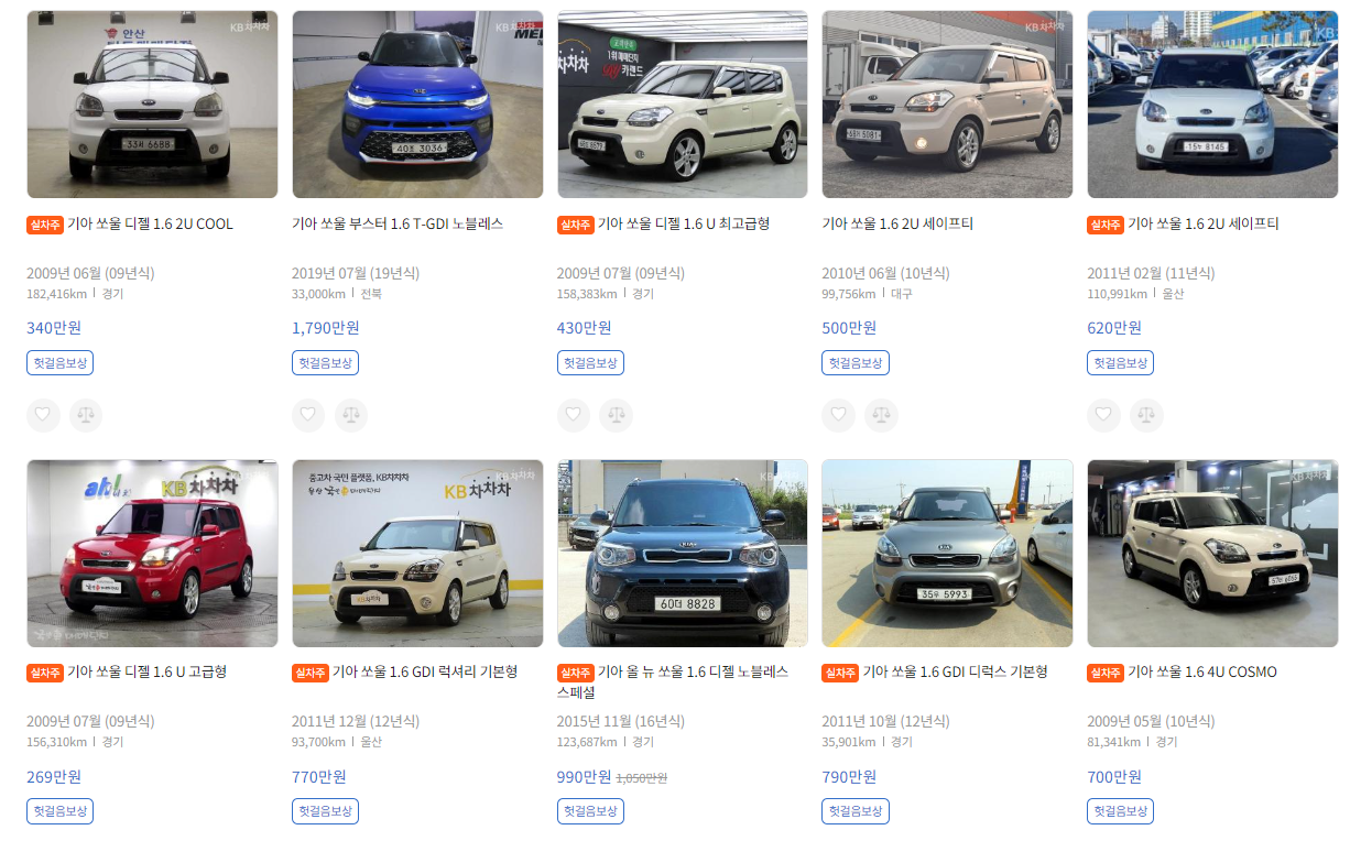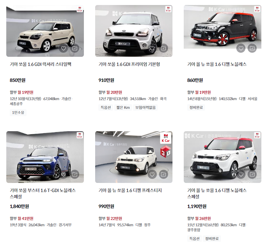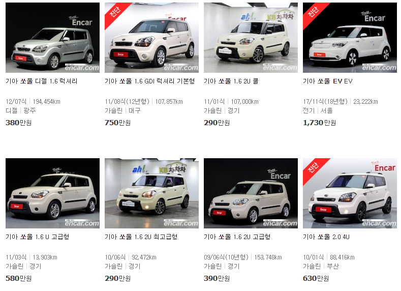 국내에서 쏘울 인기가 별로 없어 중고 매물대수가 그리 많지 않습니다. 소형차 삼대장, 모닝 레이 스파크가 시장을 꽉 쥐고있기 때문이죠. 다만 미국에선 인기가 많아 약 4만 6천대 이상의 판매고를 올린 효자상품이라고 합니다. 각 매매사이트별 특징이 다르므로 중고차를 구매한다면 꼭 이해하실 필요가 있습니다.