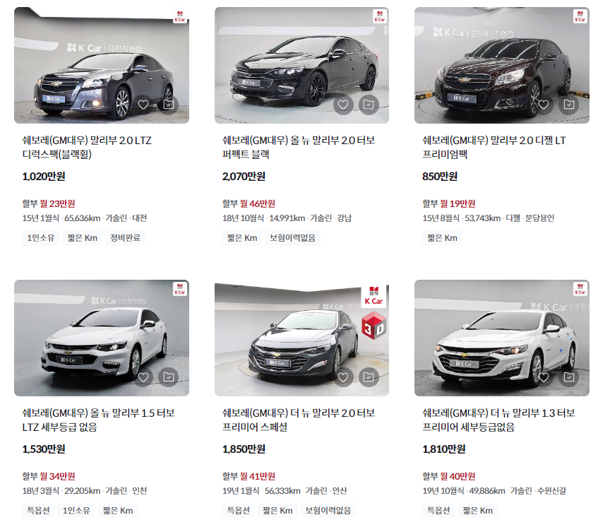 K카에 등록된 말리부 실시간 중고 시세입니다. K카는 직접 차량을 수입하여 정비 및 수리를 거쳐 엄선된 차량을 재판매하는 직영점입니다. 그래서 허위매물이 존재할 수가 없죠. 가격대가 높지만 중고차 거래가 쉽지 않으시면 마음 편히 K카에서 구매하시는 것이 좋겠습니다. 잘 찾아보면 K카에서도 합리적인 가격대로 중고차 구할 수 있습니다. 18년식 2.9만km 1530만, 15년식 6.5만km 1020만 등의 매물이 등록되어 있습니다.