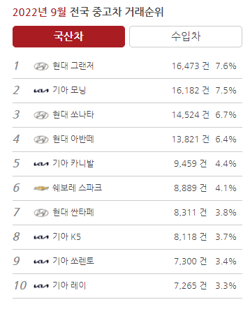그랜저는 22년 9월 1만6천건의 거래량으로 중고차 거래순위 1위입니다. 아반떼의 거래량이 다소 하락했네요.