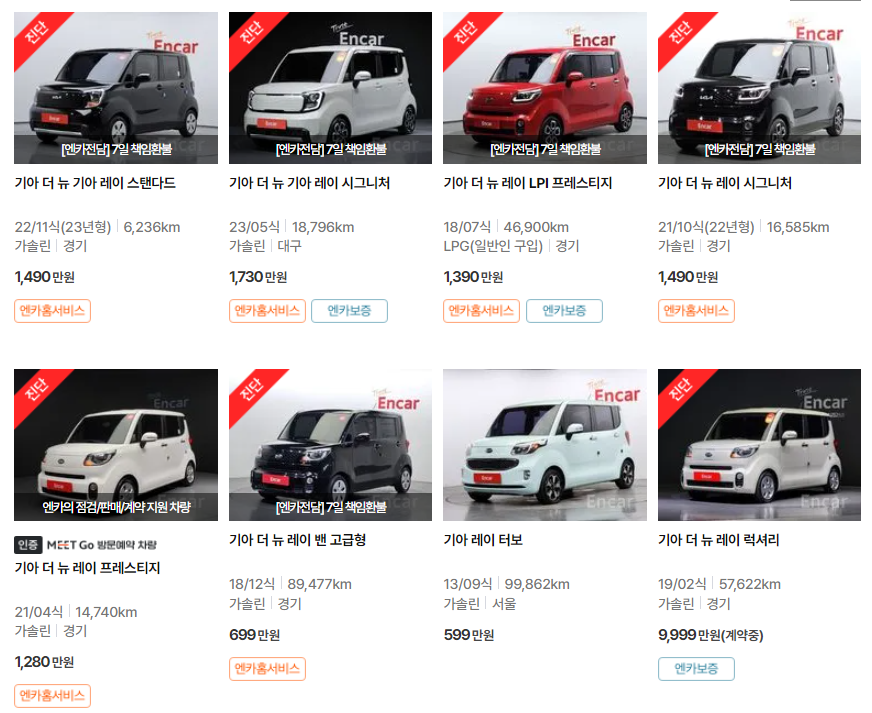엔카에 실시간으로 등록된 레이 중고 매물입니다. 22년식 6천km 1490만, 13년식 10만km 599만, 21년식 1.4만km 1280만 등의 매물이 있습니다. 중고차 시세가 하락하고 있으므로 이때가 구매 적기라고 생각합니다. 직접 매물시세 둘러보면서 주행거리, 연식별 가격을 익히시면 좋습니다.