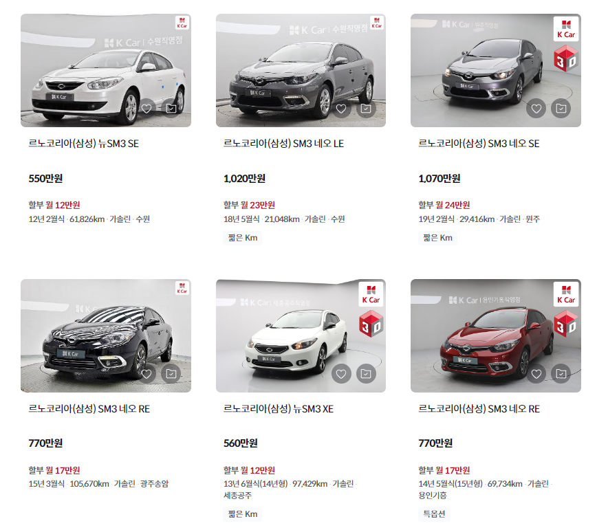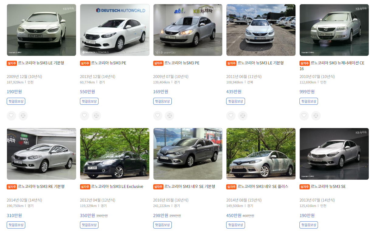 KB차차차에 등록된 실시간 SM3 중고 매물입니다. 엔카와 비슷한 성격의 매물이 많습니다. KB차차차 진단이나 엔카진단을 마친 모델의 경우 가격대가 조금 더 높습니다. 그만큼 정비 및 성능점검표에서 통과된 차량들이구요. KB차차차는 3일 환불제도가 있어 단순변심으로도 탁송비만 지불하면 환불이 가능합니다.