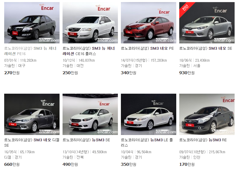 엔카에 등록된 실시간 SM3 중고차 매물입니다. 전기차 Z.E 매물은 거의 안보입니다. 07년식 11만km 270만원, 14년식 4.9만km 490만원, 19년식 2.3만km 930만원 등의 매물이 있습니다. 개인적으로 준중형 모델 중 SM3 가성비가 매우 뛰어나다고 보는데요. 연비가 동급차량대비 우수하기 때문이죠. 유지비 아끼는게 얼마나 큰지는 다들 아실테지요