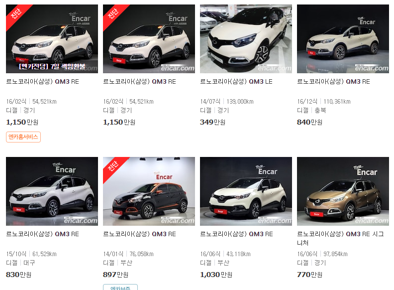 엔카 QM3 실시간 매물입니다. 16년식 5.4만km 1150만, 15년식 13.9만km 349만, 17년식 4.3만km 1030만 등이 있습니다. 보시다시피 주행거리별 가격대 차이가 많이 나고 있습니다. 오래된 연식은 성능점검표 확인법을 참고하여 안좋은 매물은 피하시길 바랍니다. 정비비용이 더 나올 수 있으니 말이죠..