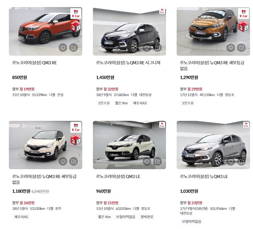 K카에 등록된 QM3 매물입니다. K카는 직영점이라, 엔카나 KB차차차같이 개인딜러와 거래하는 매매사이트보다 가격대가 높습니다. 그만큼 품질이 보장된 매물들을 내놓는다는 특징이 있구요. 18년식 10만km가 1030만원으로 확실히 비싸죠. 중고차 거래가 걱정된다면 k카에서 거래하는 것이 안전할 수 있습니다.