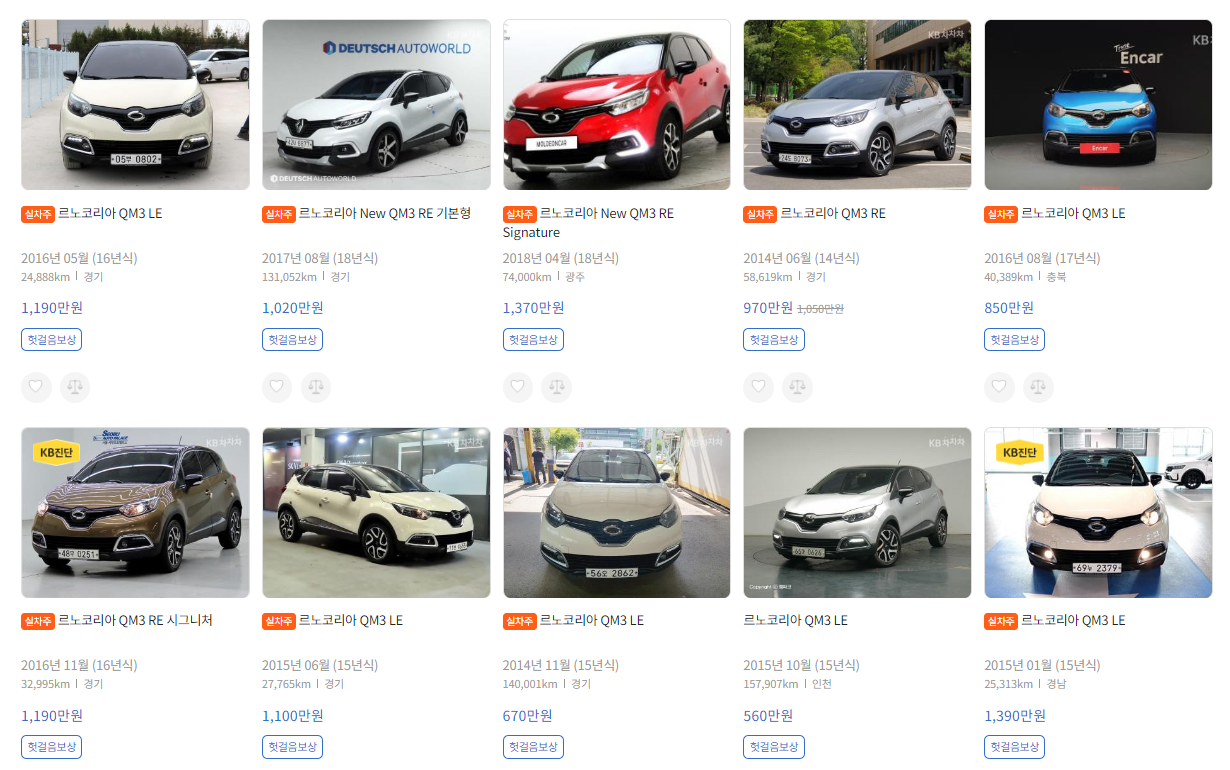 KB차차차에 등록된 QM3 실시간 매물입니다. KB진단을 받은 차량의 경우 가격대가 더 높구요. 왼하단에 16년식 3.2만km 1190만원에 등록된 매물이 썩 괜찮아 보이네요. kb차차차는 3일 환불보증제도가 있어 단순변심에도 환불이 가능합니다. (탁송비 제외) 전체적으로 엔카와 비슷한 매물 및 가격대입니다.