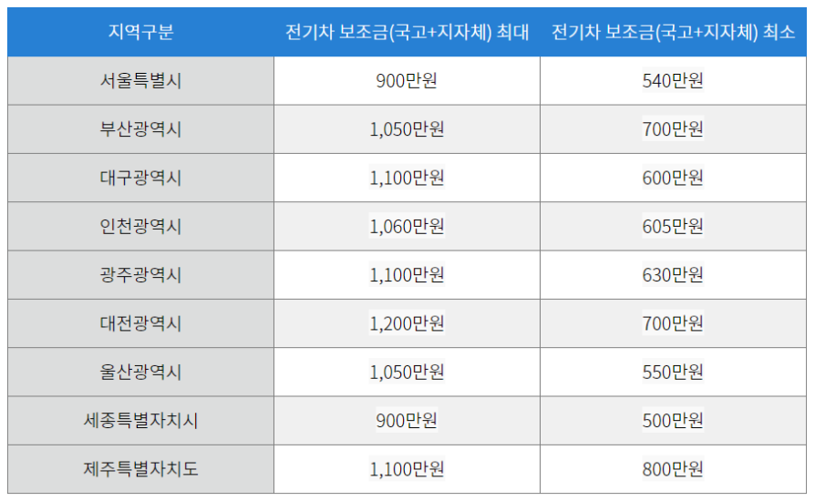 지자체별 보조금은 지역마다 다른데요. 아래 표를 보실게요.