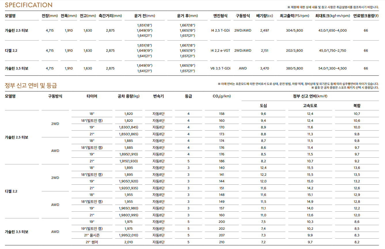 | 등급 | 2.5 가솔린 | 3.5 가솔린 | 2.2 디젤 |