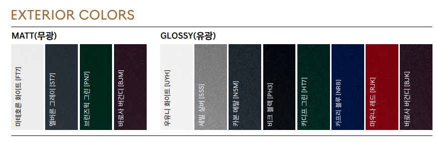 무광은 70만원 추가옵션입니다. 유광은 우유니 화이트, 세빌 실버, 카본 메탈, 카디프 그린, 카프리 블루, 마우나 레드, 바로사 버건디로 총 8개의 컬러가 있습니다. 무광이 진짜 이쁘긴 하죠...