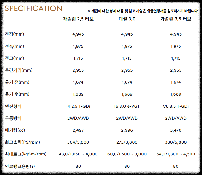 추가옵션에서 가장 큰 부분은 바로 엔진입니다. 디젤 3.0 400만, 가솔린 3.5 터보 570만 옵션인데요. 위에서 언급했듯이 속도감을 즐기고 여유가 되는 분들에게 3.5 엔진을 추천드립니다.