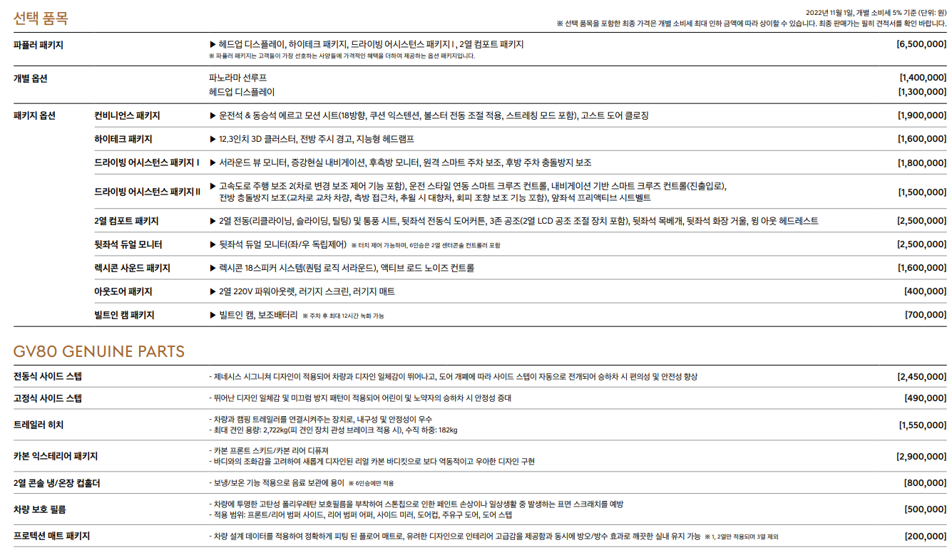 제네시스 GV80에서 선택옵션을 고른다면 마음 편하게 파풀러 패키지 고르는게 낫습니다. 파풀러 패키지 자체가 사람들이 가장 선호하는 옵션을 묶어서 할인판매하는 형식입니다.