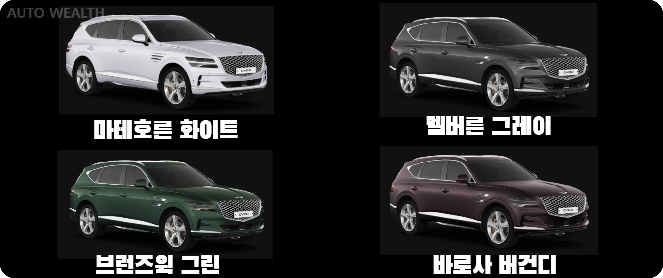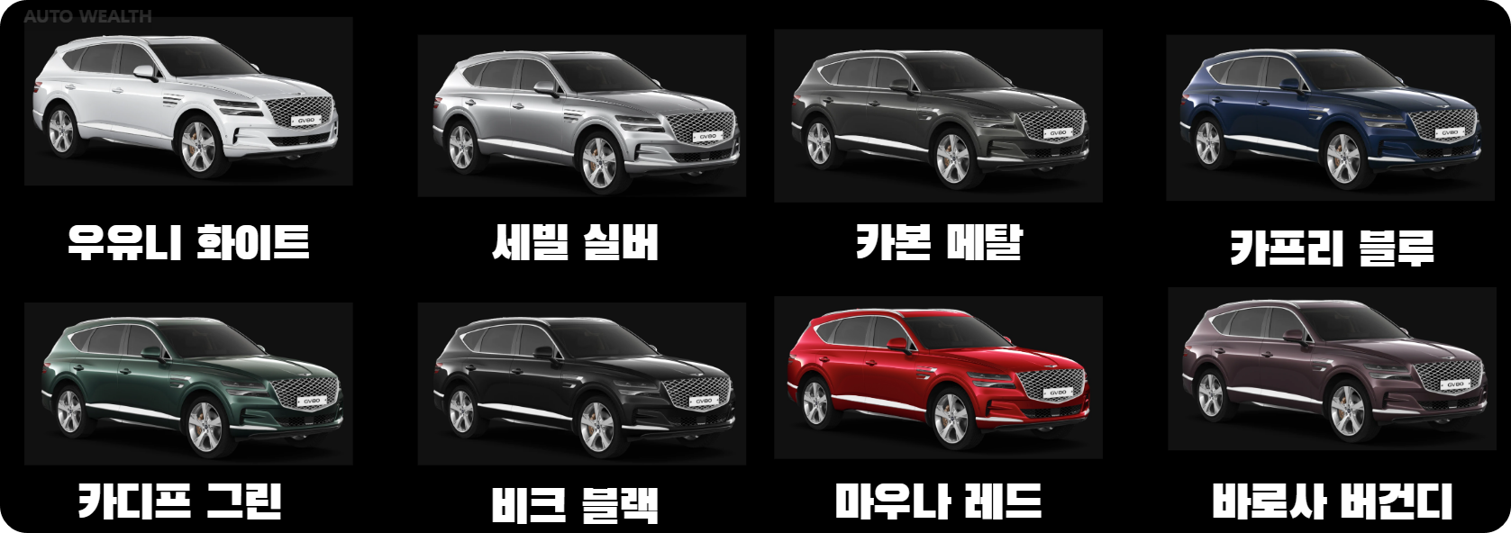 GV80에서 가장 선호도가 높은 컬러는 우유니 화이트, 카본 메탈, 비크 블랙입니다. 역시 깔끔한 블랙앤화이트 색상이 인기가 많네요!