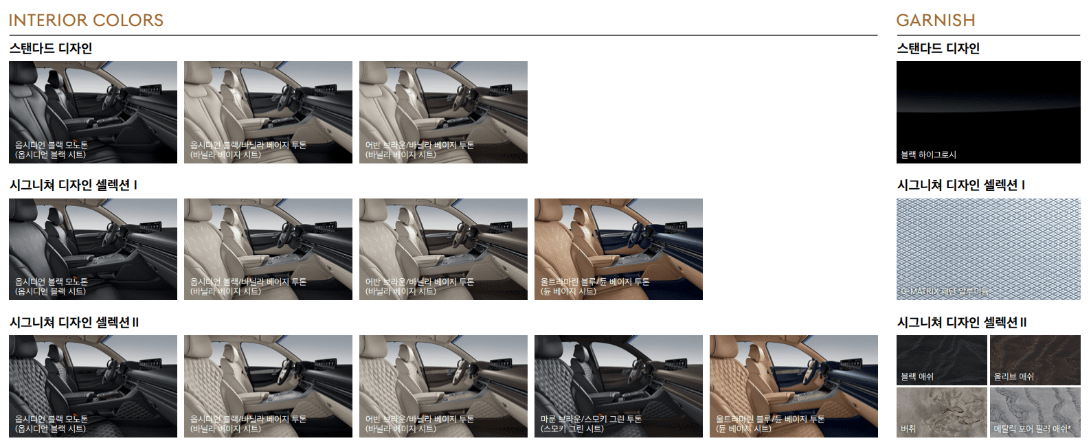 이외에 시그니처 디자인 셀렉션도 인기가 많습니다. G-MATRIX 패턴 알루미늄 내장재로 고급스러운 내부 디자인을 업그레이드 할 수 있죠. 옵션을 더 붓는다면 셀렉션 II에서 프라임 나파 가죽시트가 진짜 고급스럽더군요. (강추)
