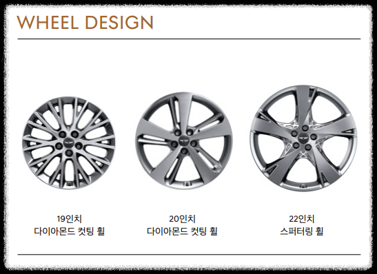 가솔린 3.5 터보가 아니라면 스퍼터링 휠은 가격적으로 부담이 되므로 20인치 휠 추가 (120만원)을 추천합니다. 물론 여유가 있다면 22인치가 최고긴 하죠!!