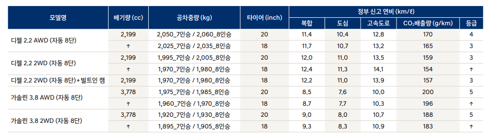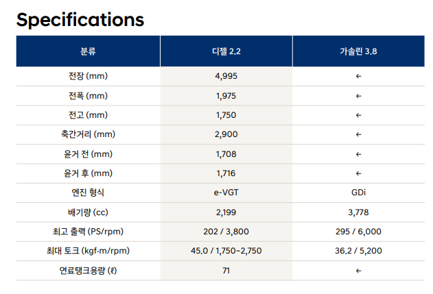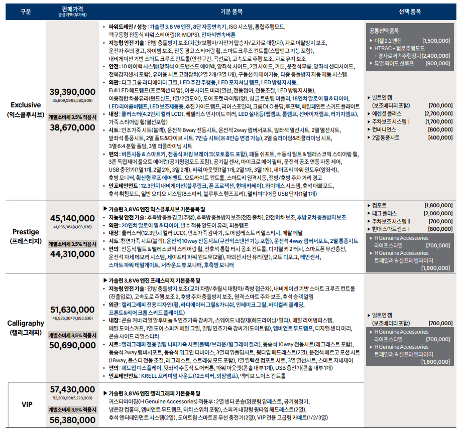 | 등급 (개소세3.5% 적용) | 3.8 가솔린 | 2.2 디젤 |