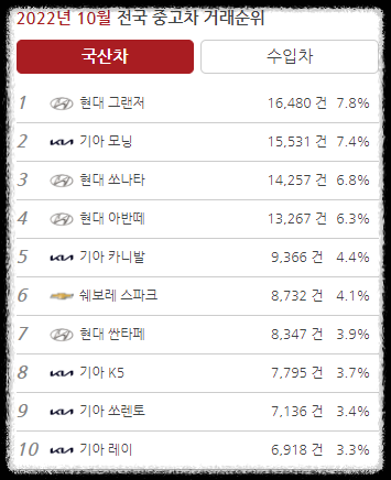| 경형 중고차 시세 총정리 | 모닝 레이 스파크 캐스퍼 중고 가격! (0) | 2022.12.22 |