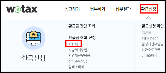 1. 위택스 홈페이지에 접속하여 [환급신청 - 지방세] 순서로 클릭합니다.