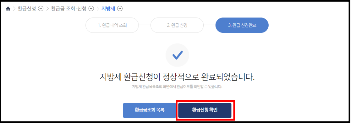 4. 자동차세 환급신청이 완료되면 아래와 같은 화면이 뜹니다. 이후 환급신청 확인을 클릭하여 신청진행 현황을 보실 수 있습니다.