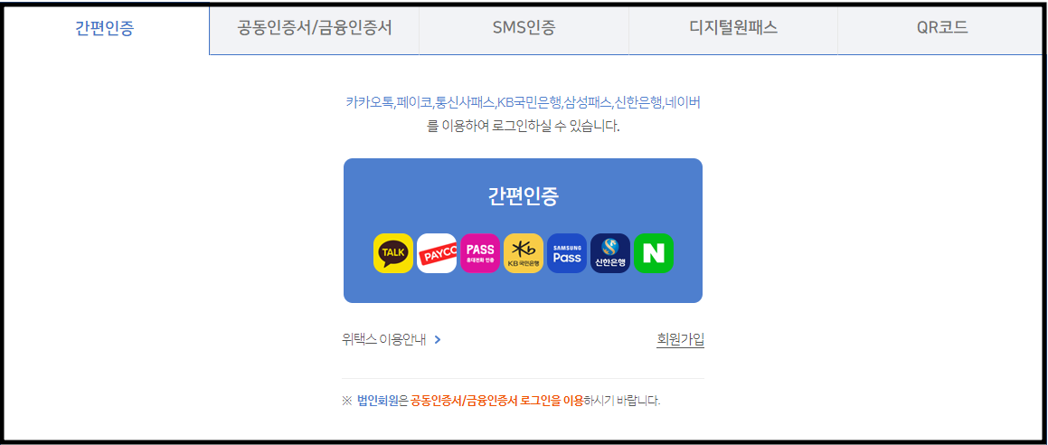 2. 간편인증 (카카오톡,네이버, 금융사) 로그인 및 공동인증서로 로그인을 진행합니다.