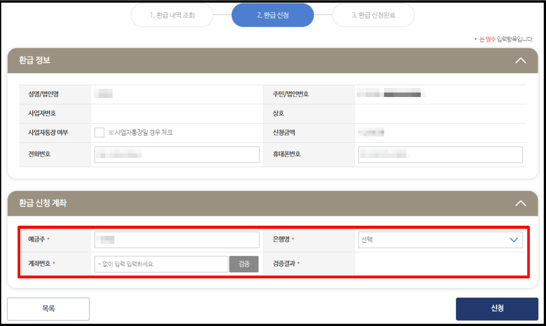 3. 이후 환급금 내역 조회 이후 환급금을 지급받을 계좌를 입력하고 환급신청을 완료합니다.