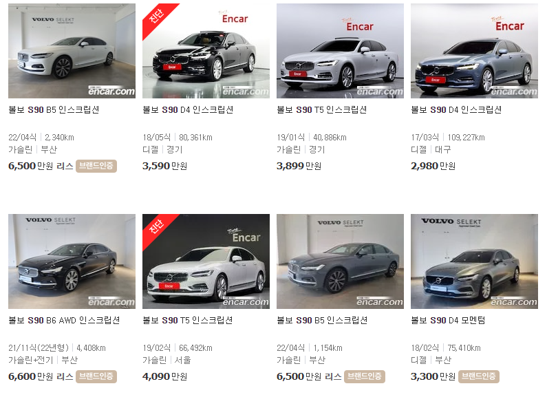 엔카에 실시간으로 올라온 S90 매물입니다. 가격대가 높은 수입차라 리스로 운용되는 차량이 많습니다. 중고는 19년식 8만km 3590만, 19년식 4만km 3899만, 18년식 10.9만km 2980만 등이 있습니다.