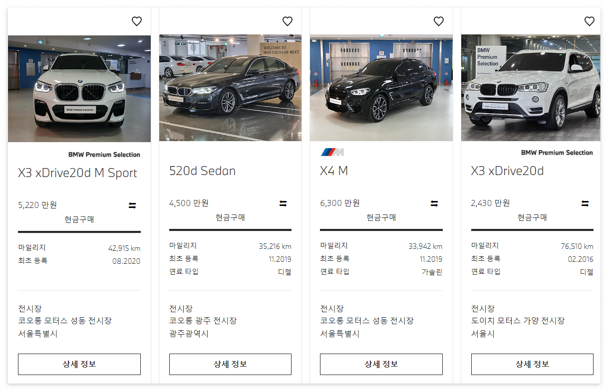 21년식 BMW X3 인증 중고 가격이 5220만원인데, 엔카와 비슷해도 꿀리지 않는 중고가격입니다. 이외에 20년식 520d 세단 3.5만km가 4500만원, 20년식 X4 M 3.3만km 6300만원에 올라와있습니다.