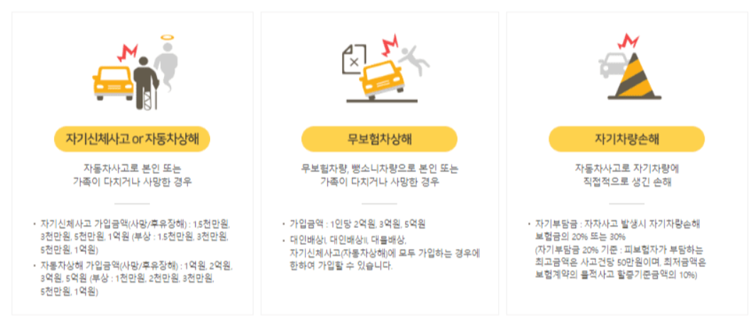 대인배상 1,2 대물배상, 자기 신체사고에 모두 가입하는 경우에 한하여 가입할 수 있습니다. 무보험차 차량에 사고를 당했을 경우 보험 보장을 덜 받는 경우도 종종 있기 때문에 가입하시면 좋습니다.