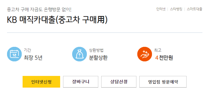 KB 중고 자동차 대출은 영업점 방문 필요 없이 바로 받을 수 있습니다. 제1 금융권이기 때문에 캐피털 대비 금리가 좋은 것은 당연하고요. 취급수수료도, 근저당 부담도 없기 때문에 대출만 나온다면 가장 좋은 대출 중 하나입니다.