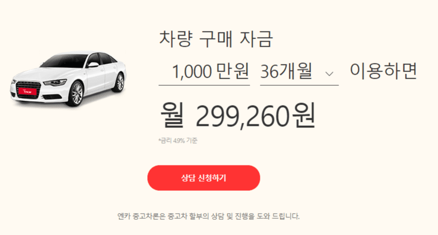 보통 대출금액은 중고차의 시세에 맞춰서 나오기 때문에, 구매하려는 차량의 중고시세를 확인하시고 대출한도를 예상해 보시면 좋습니다.