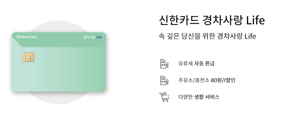 다음으로 소개드릴 캐릭터는 신한카드 경차사랑 Life입니다. 경차 SMART 롯데카드와 마찬가지로 주유소 할인 혜택이 있기 때문에 할인을 더 받으실 수 있습니다.