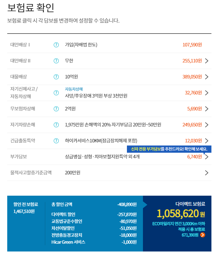 뭐 대충 필수 특약 가입하고 없을만한거 빼고 보장내용 웬만한거 최대로 넣으니 105만원 정도 나오네요. 님들도 직접 한번 조회해보시면 얼마정도 나오나 계산이 서실겁니다. 그리고 보험사별로도 차이 많이 나는 경우가 있으니 꼼꼼히 하나씩 확인해보세요.