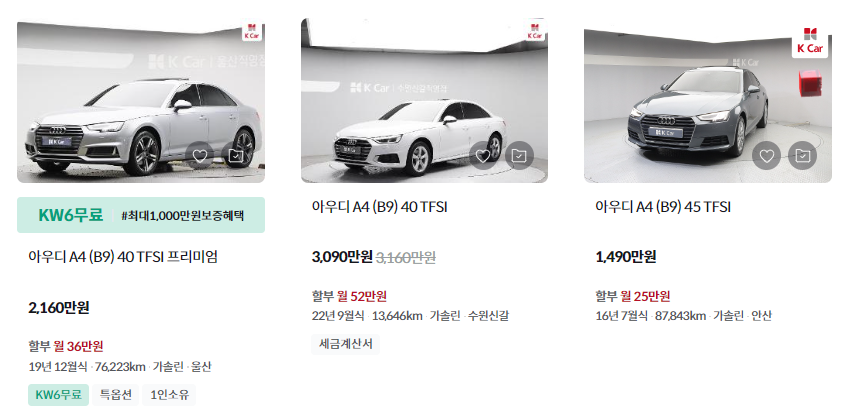 K카 - 아우디 A4 실시간 매물