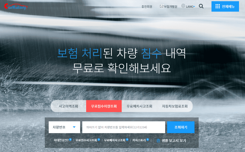 직접 침수차로 신고하는 경우가 많진 않지만, 카히스토리에서 번호판으로 침수차 무료 확인이 가능합니다. 구매할 차량이 생긴다면 번호 조회 해보시면 좋겠습니다.