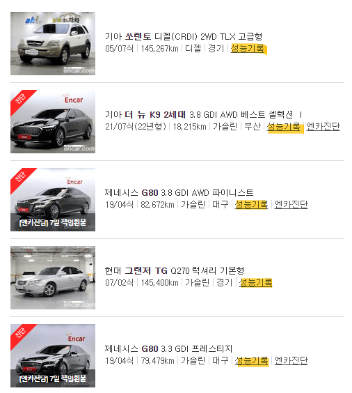 엔카 왼쪽하단에 성능기록부랑 보험이력 체크하시고 원하는 매물 찾아보시면 됩니다.