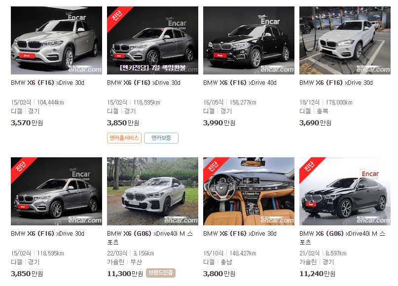 BMW X6 매물대수입니다. 엔카와 KB차차차에 각각 659대, 334대씩 등록되어 있습니다. 15/16연식 매물이 많이 보이고, 가격대는 3-4천 정도로 올라온 모습입니다. K카는 직영점으로 운영되어 깔끔한 매물들이 있지만 가격대가 높더군요. 중고차 구매하실때 유의점에 대해 모르신다면 아래 글을 참고해주세요!