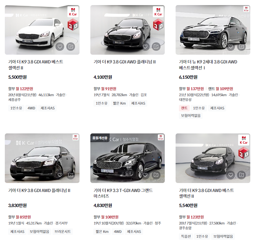 K9은 엔카와 KB차차차에 각각 1천여대 이상씩 등록되어 있습니다. 대형세단이라 매물이 많진 않지만, 감가가 커서 거래량이 많은 매물중 하나입니다. 대형세단 언제쯤 한번은 꼭 타보고 싶네요!! K카는 직영점이라 매물이 비교적 적은 모습입니다. 그만큼 품질이 보장된 매물과 높은 가격을 자랑합니다.