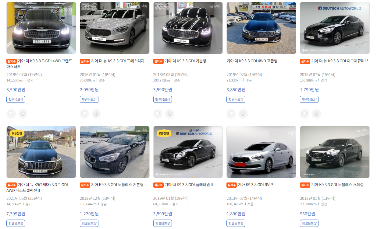 KB차차차 K9 매물입니다. 엔카와 비슷한 매물이 많이 보이더군요. 22년식 1.4만km 7399만 이건 거의 새차 같구요. 13년식 20.9만km 는 950만원으로 아주 오래된 연식의 차량은 1천만 아래로도 구할 수 있습니다. 엔카랑 kb차차차는 보증시스템을 거친 차량이 아니면 개인딜러와 거래하기 때문에 허위매물 조심하셔야겠습니다.